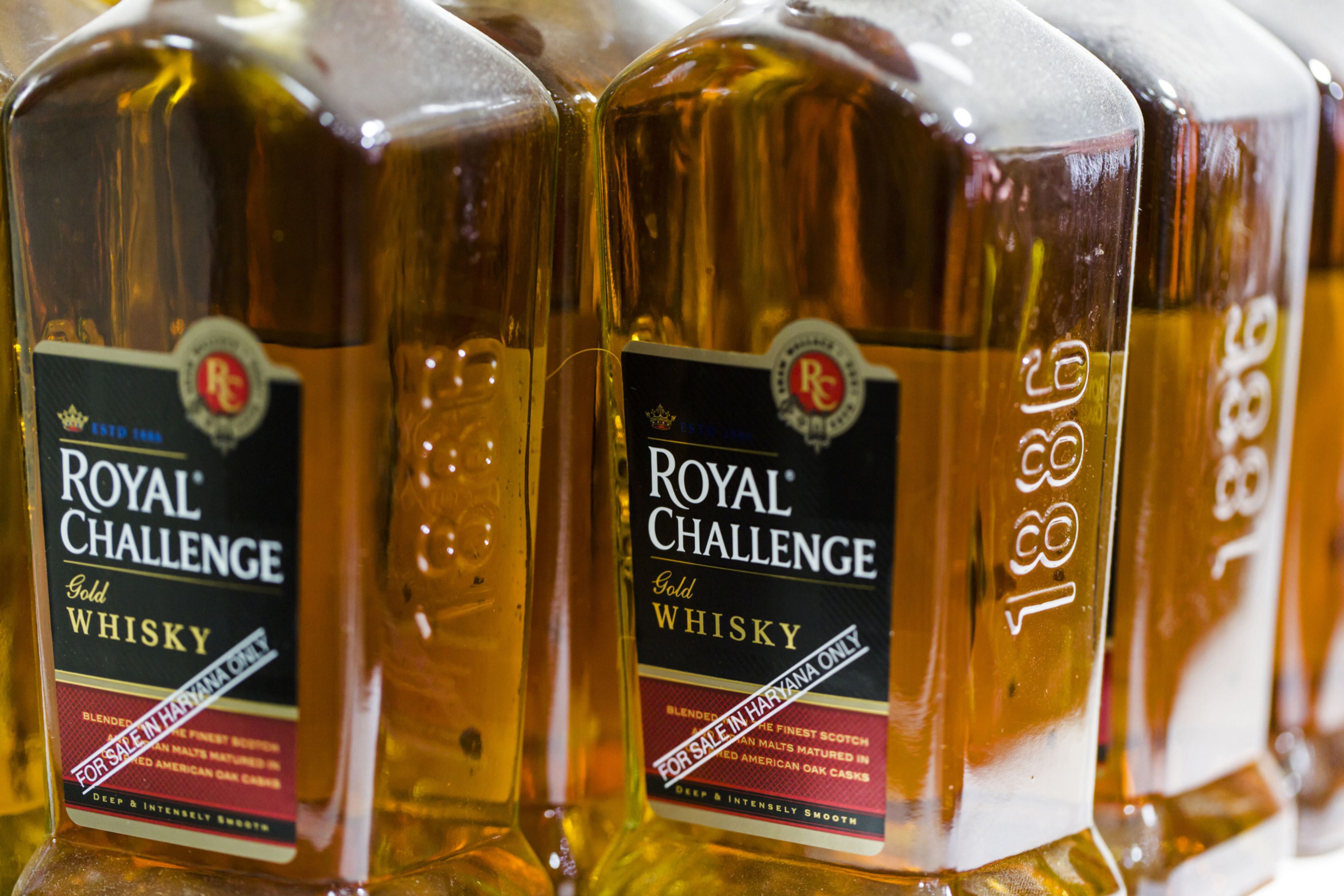 Bottles of Royal Challenge whiskey produced by United Spirits Ltd. sit on display at a roadside liquor store in Gurgaon, Haryana, India. (Photographer: Udit Kulshrestha/Bloomberg)