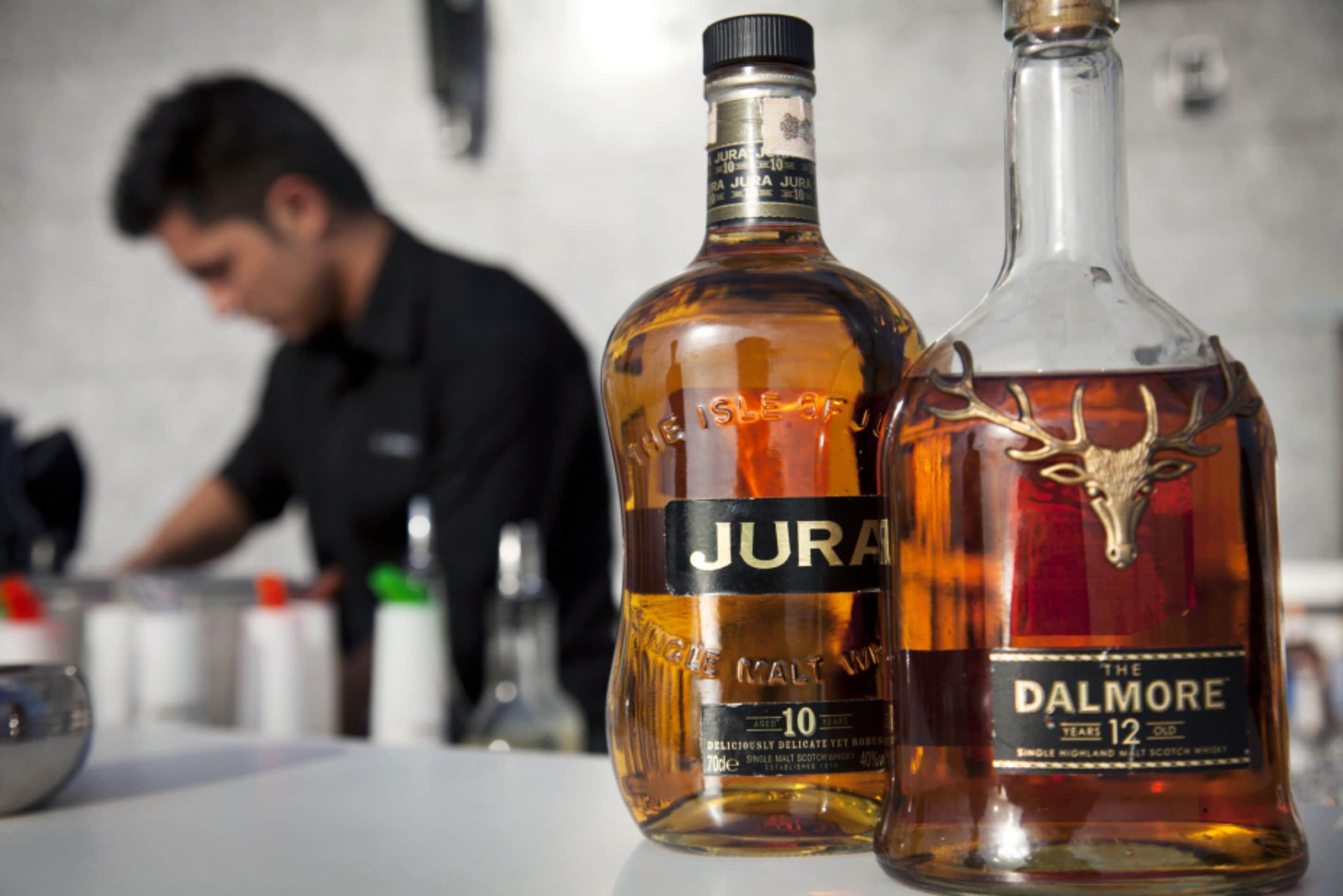 Bottles of United Spirits Ltd.’s Jura, left, and Dalmore Scotch whiskies are arranged for a photograph. (Photographer: Kuni Takahashi/Bloomberg)