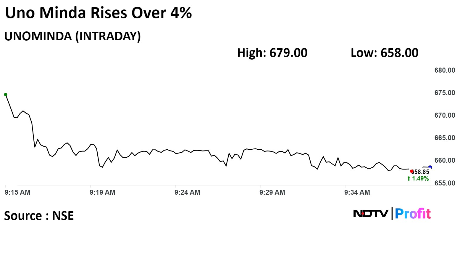 Shares of Uno Minda rose as much as 4.59% to Rs 679 apiece, the highest level since Feb 9. It was trading 1.97% higher at Rs 662.00 apiece as of 9:34 a.m. This compares to a 0.29% decline in the NSE Nifty 50.