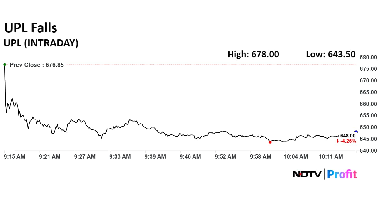 UPL share price declined 4.93% to Rs 643.50 apiece. It was trading 4.29% down at Rs 647.80 apiece as of 10:19 a.m., as compared to 0.66% decline in the NSE Nifty 50 index.