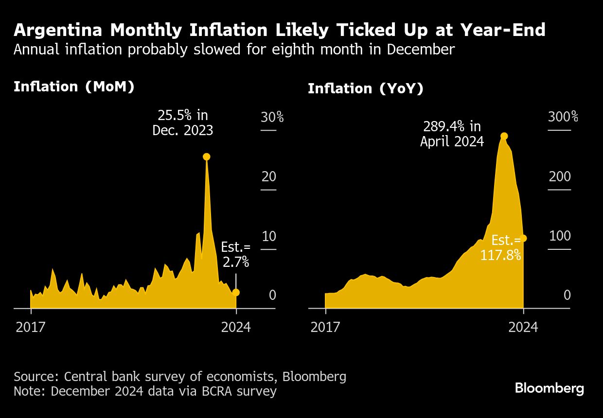 The week also sees Argentina release December inflation data that's expected to show the annual print slowing for an eighth month to just under 120%, after peaking at almost 290% in April. Economists surveyed by the central bank see it ending 2025 at 25.9% before declining further to 15.3% in 2026 and 10% in 2027.