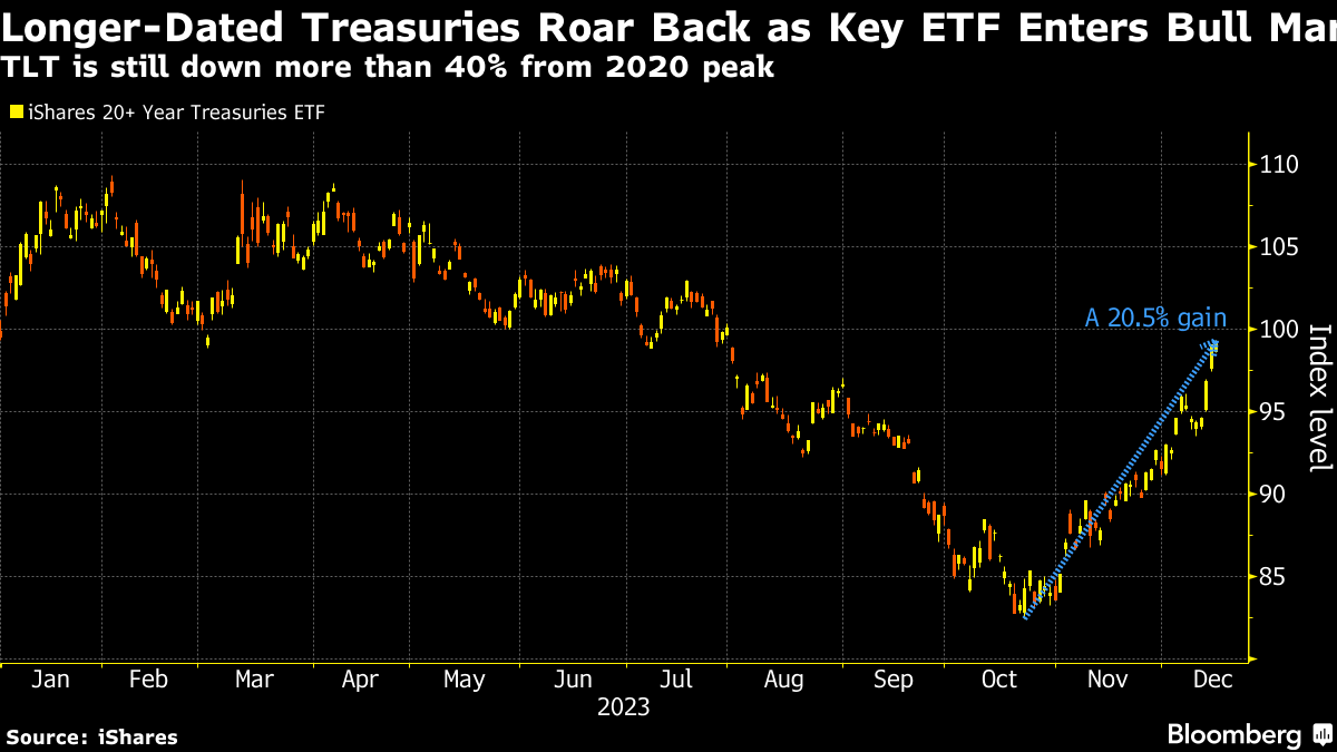 The iShares 20+ Year Treasury Bond ETF, a popular tool for betting on long-dated debt, jumped to touch 99.35 on Friday. That's a gain of 21% from the 16-year low reached on Oct. 23, qualifying as a bull market. The gauge is still down more than 40% since it peaked in 2020.