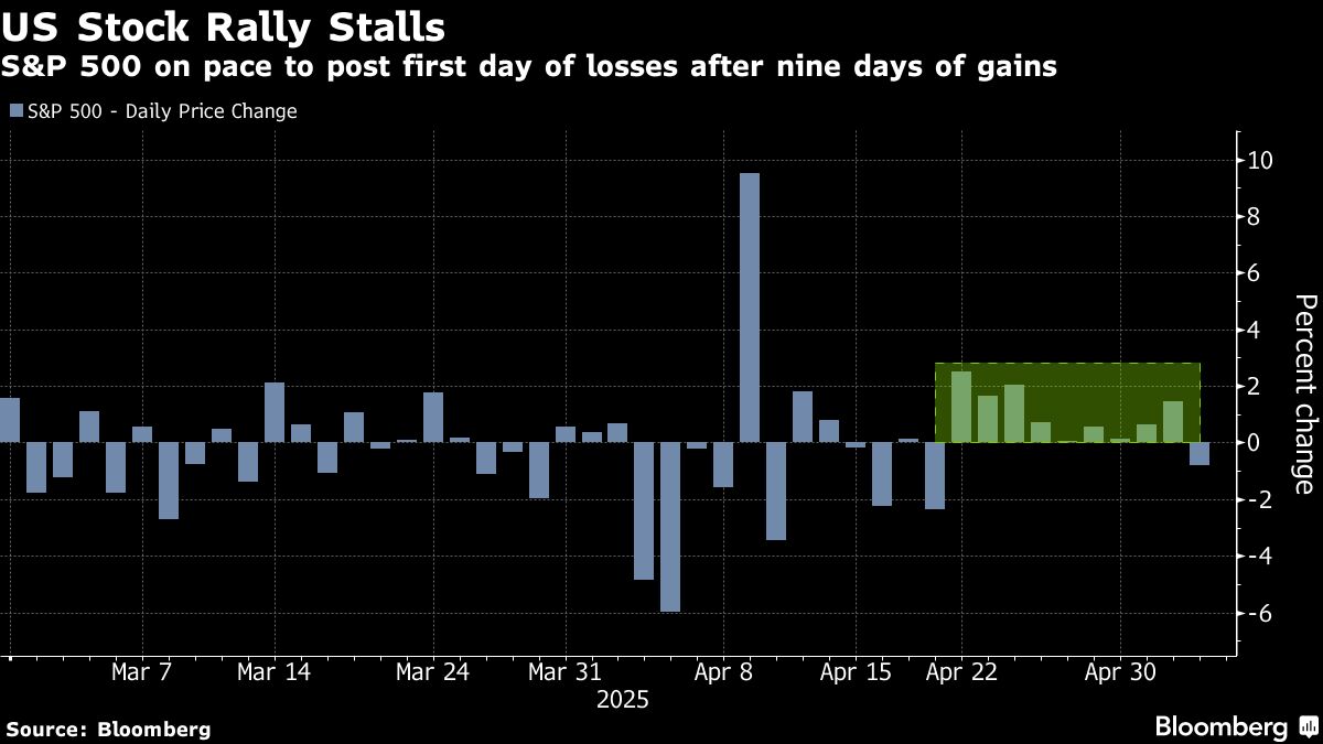 US stocks fell Monday with the S&P 500 on track to snap its longest winning streak in two decades as mixed messages on trade policy clouded the market outlook.