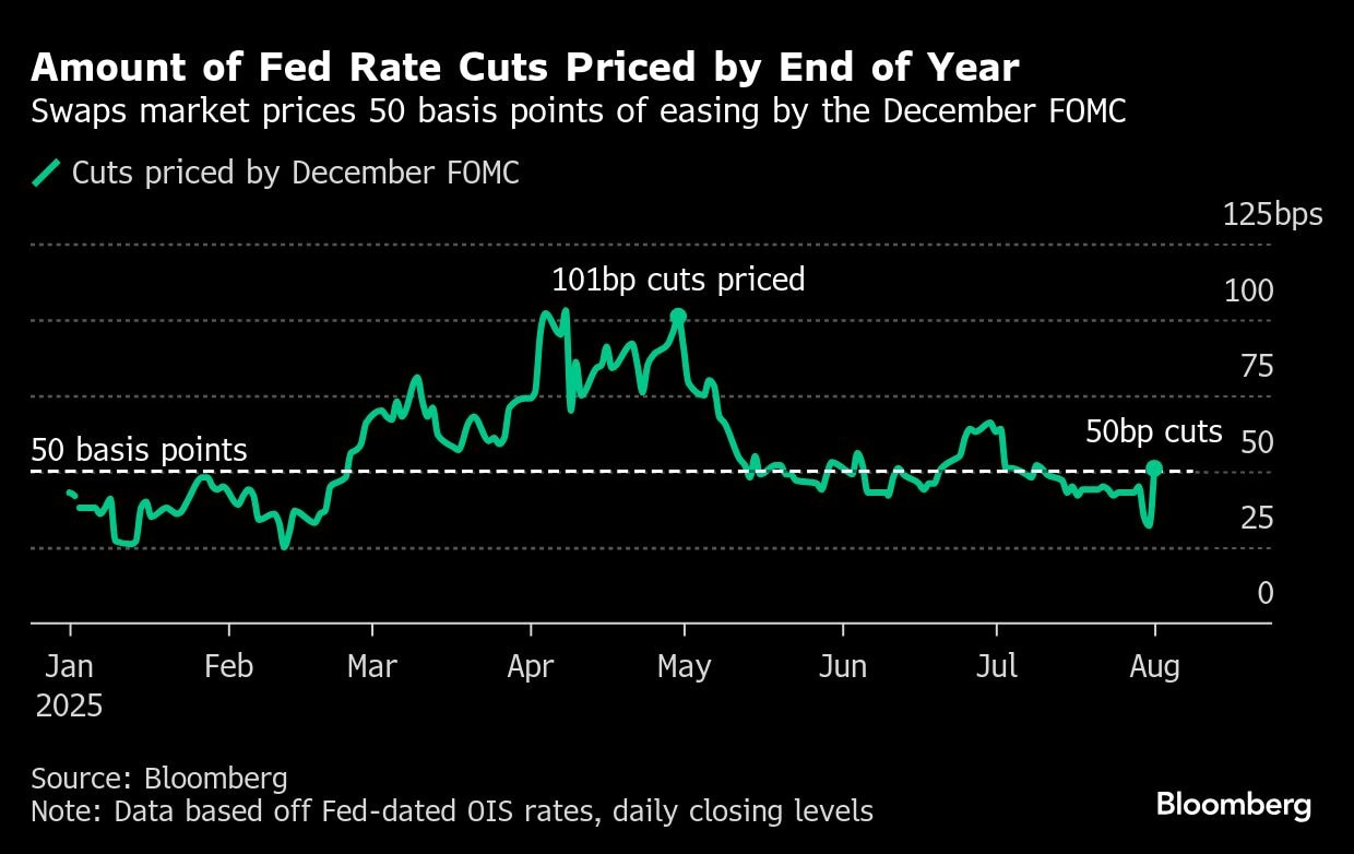 The jobs report suggests Waller's camp “may hold sway or convince more people to come on his side of the argument. And maybe they missed the opportunity in July but it raises the odds you get it in September,” said Jeffrey Rosenberg, portfolio manager at BlackRock Inc., said on Bloomberg Television. “That is why you are seeing the big move on the front end of the curve.”