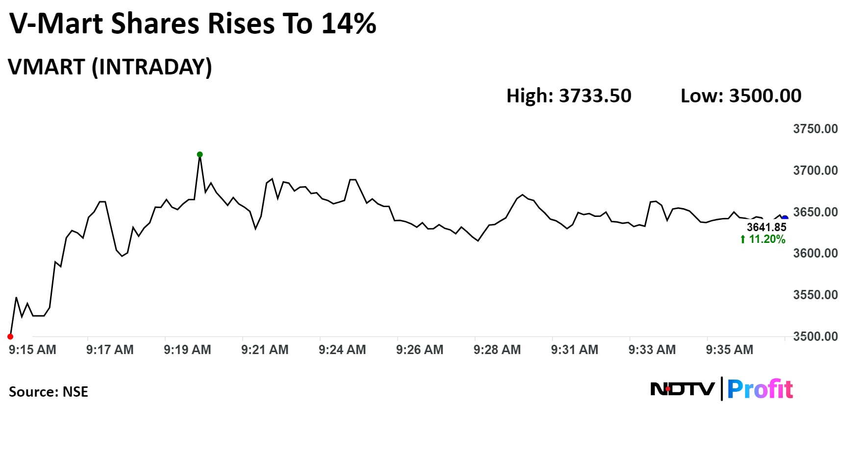 On the NSE, V-Mart's stock rose as much as 14% during the day to Rs 3,733.50 apiece, the highest since April 6, 2022. It was trading 10.25% higher at Rs 3,610.70 per share, compared to a 1.1% rise in the benchmark Nifty 50 as of 9:49 a.m.