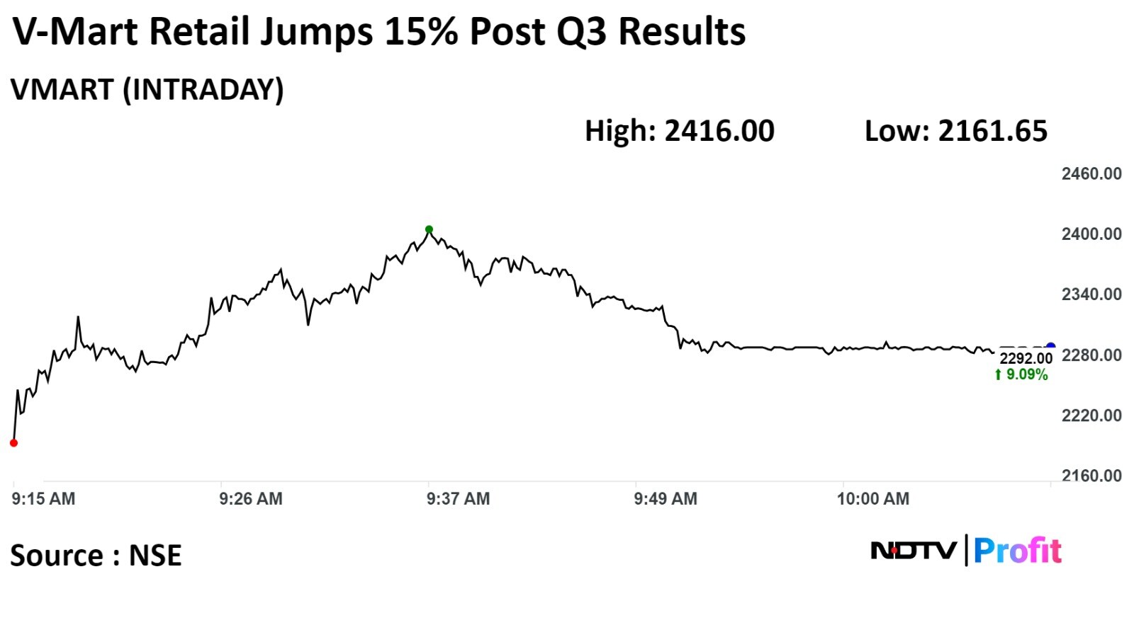 Shares of V-Mart Retail Ltd. jumped 15% to record high on Wednesday after its third-quarter profit beat analysts' estimates.