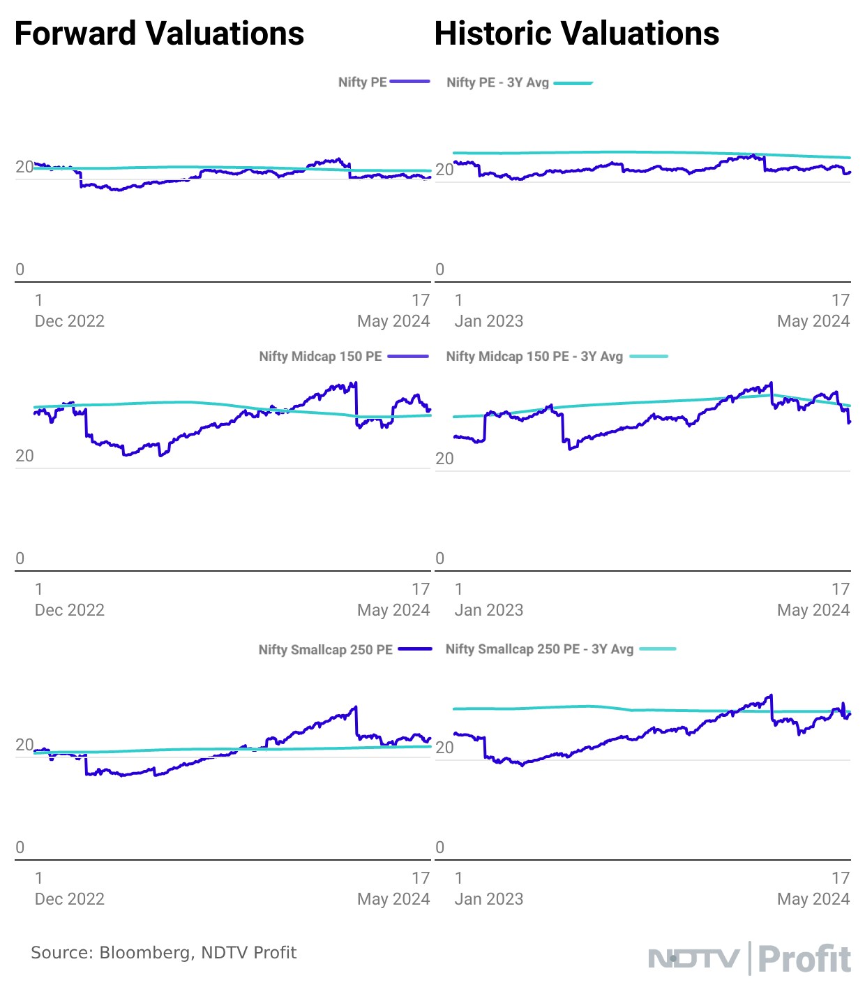 Currently, the Nifty 50 index trades below both the three-year average of its historic valuations, as well as those based on forward estimates, while the mid and small-cap indices trade near the three-year average levels on both fronts.