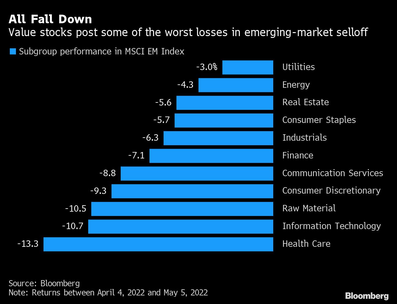 Value stocks are typically favored at the start of tightening cycles because their superior earnings and dividend yields help investors to cushion the impact of higher borrowing costs and the consequent reassessment of equity valuations. But now, that connection is broken. The MSCI EM Value Index has tumbled 16% in the past three months, tracking a 20% decline in the corresponding gauge for growth stocks.