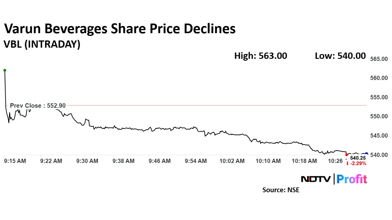 Varun Beverages share price declined 2.32% to Rs 540.05 apiece. It was trading 2.17% down at Rs 540.90 apiece as of 10:31 a.m., as compared to a 0.81% decline in the NSE Nifty 50.