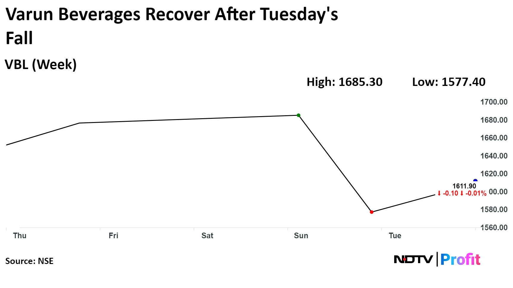Shares of Varun Beverages rose as much as 2.7%, before paring some gains to trade 2.2% higher at Rs 1,612.80 apiece, as of 10:06 a.m. This compares to a 0.3% advance in the NSE Nifty 50.