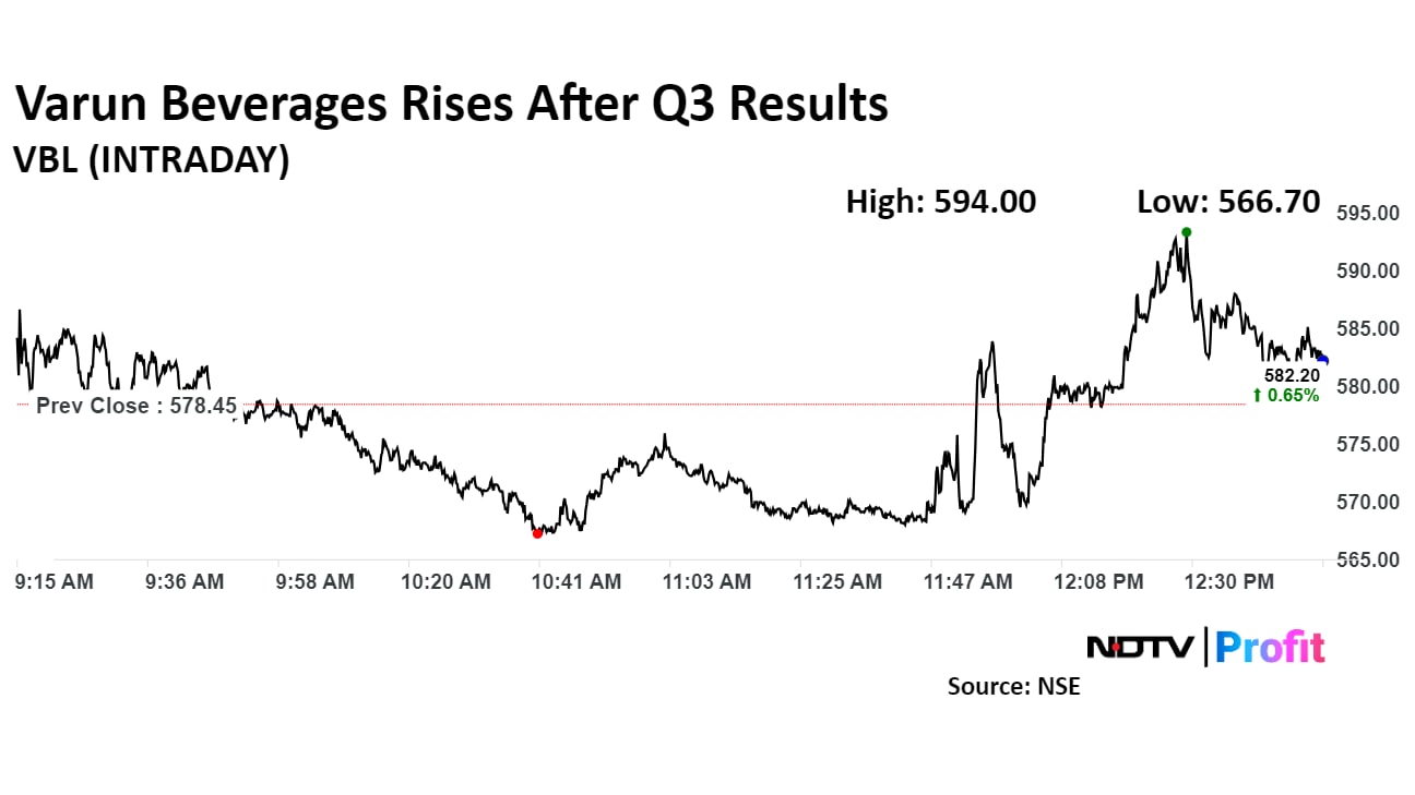 Shares of Varun Beverages spiked to intraday high of Rs 594 apiece, or 2.7% up, before cooling off to trade 0.65% higher at Rs 582.2 per share around 12:55 p.m. Meanwhile, the benchmark Nifty 50 was trading 0.7% lower.