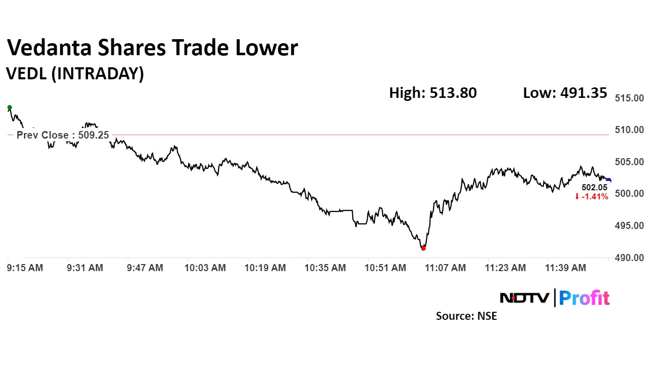 Vedanta's share price was trading 1.34% lower at Rs 501.9 apiece, compared to a 0.48% advance in the benchmark Nifty 50 as of 11:57 a.m.