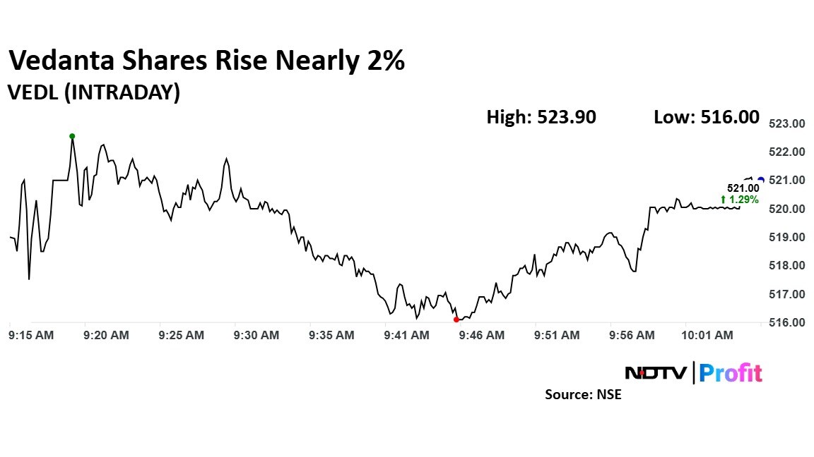 Vedanta share price rose as much as 1.86% during the day to Rs 523.90 apiece on the NSE. It was trading 1.11% higher at Rs 520.05 apiece, compared to an 0.01% decline in the benchmark Nifty 50 as of 10:05 a.m.