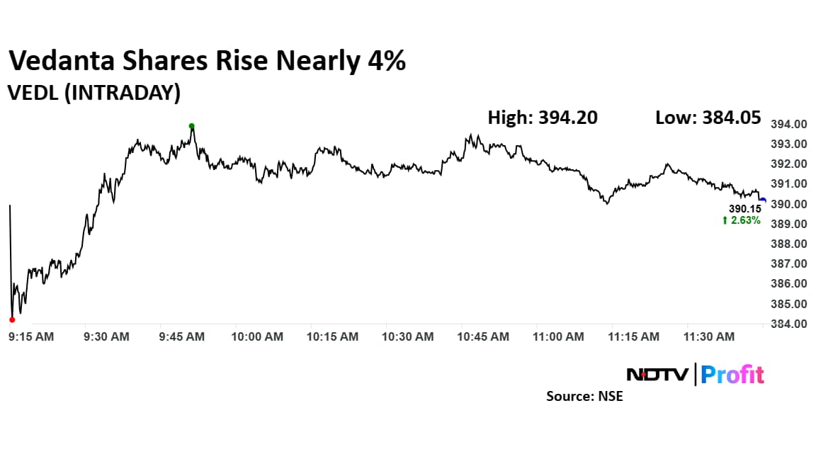 Vedanta share price rose as much as 3.7% to Rs 394.20 apiece, the highest level since April 4. It pared gains to trade 2.81% higher at Rs 390.85 apiece, as of 11:46 a.m. This compares to a 2.08% advance in the NSE Nifty 50 Index.