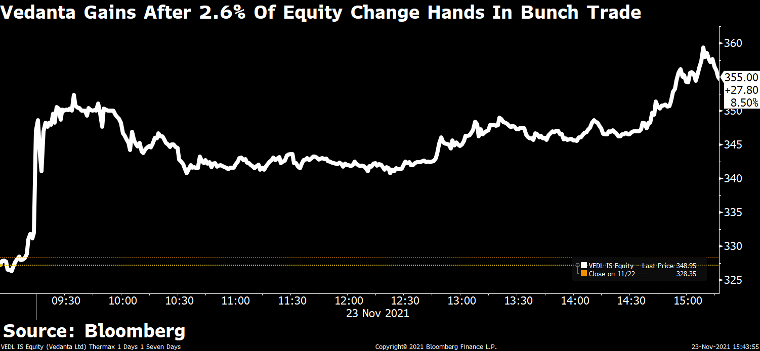 Shares of Vedanta Ltd. jumped to the highest in a month on the back of large trades.