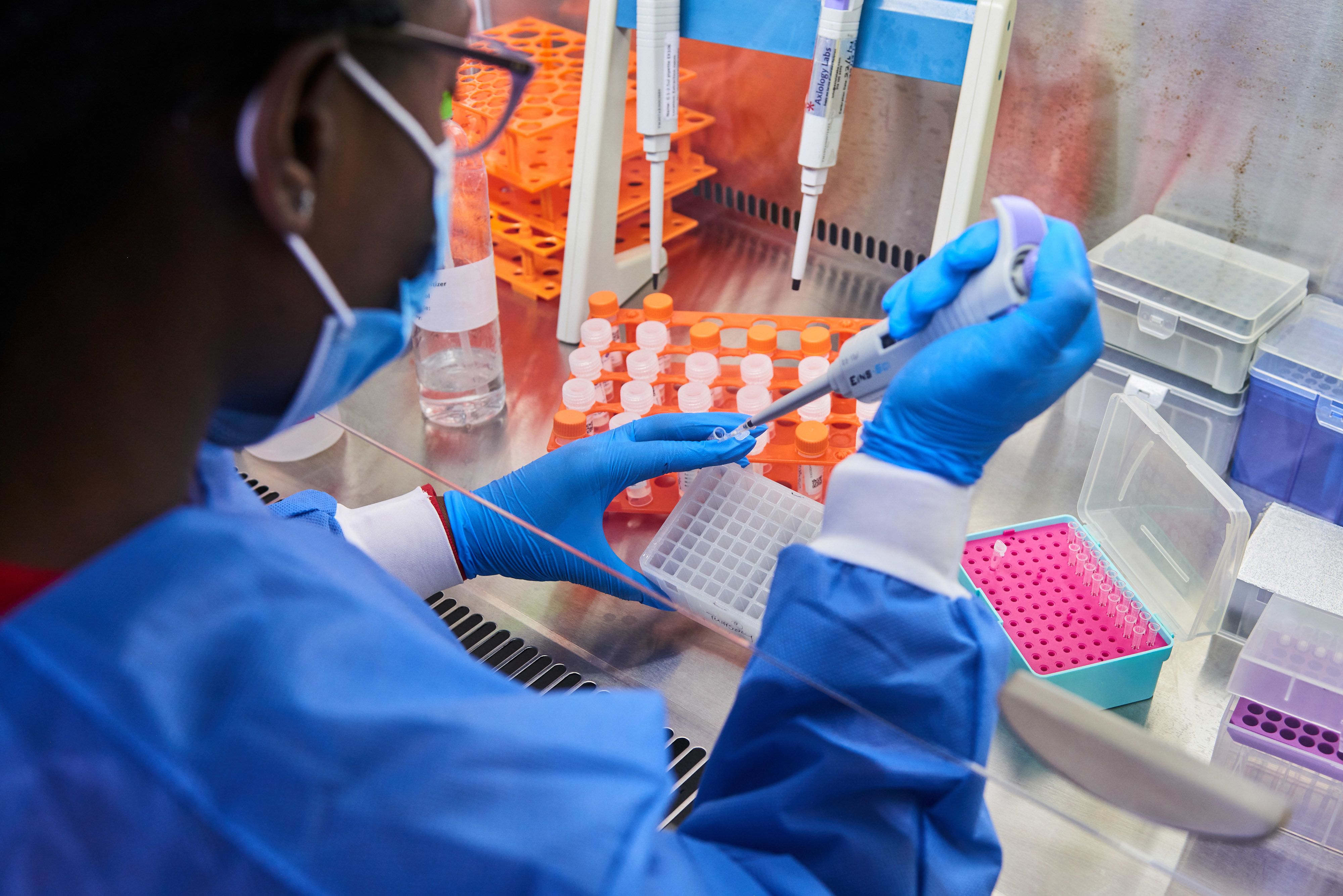 A technician uses a single channel pipette dropper at an on-site laboratory processing PCR tests in the hospital at Anglo American Platinum Ltd.'s Tumela mine in Amandelbult, South Africa. (Photographer: Waldo Swiegers/Bloomberg)