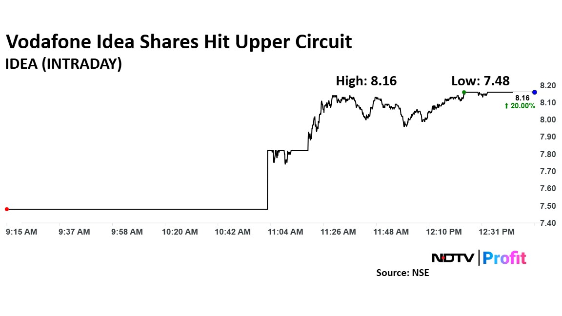 Shares of Vodafone Idea surged 25.88% to Rs 8.56 apiece to hit the upper circuit. This is the highest level since Feb. 14. The upper circuit was revised to 25% from the earlier 10% on Tuesday, with the stocks hitting over a one-month high. The stock closed 20.15% higher at Rs 8.17.