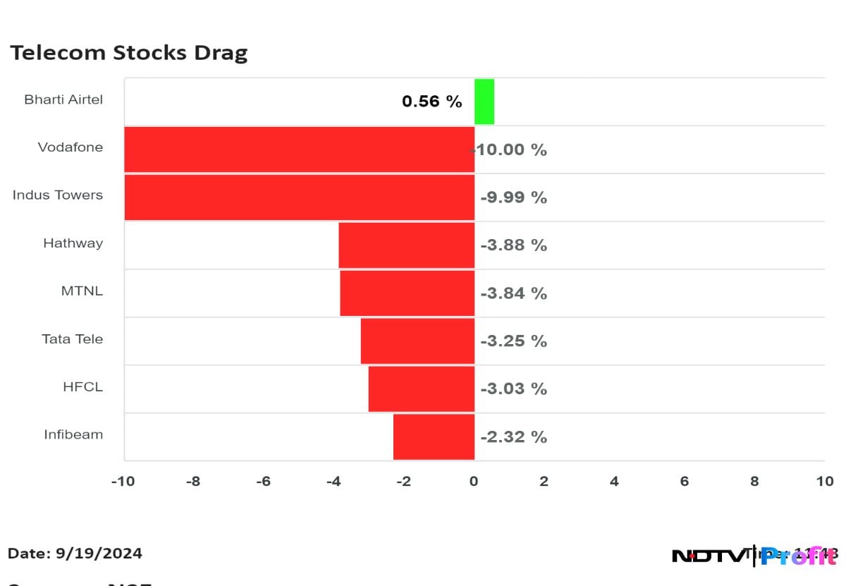 Shares of most telecommunication companies declined on Thursday with Vodafone Idea Ltd. and Indus Towers Ltd. falling the most after the Supreme Court rejected their plea seeking re-computation of average gross revenue or AGR by the Department of Telecommunication.