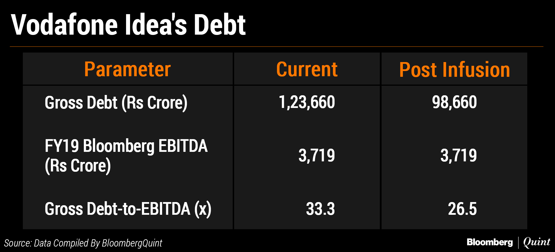 The proposed fund infusion would lower the company's leverage ratio, but it would remain high at 26.5 times its earnings before interest, tax, depreciation and amortisation, according to BloombergQuint calculations—higher than that of rivals Bharti Airtel Ltd. and Reliance Jio Infocomm Ltd. The infusion would reduce Vodafone Idea's debt by 20.2 percent.