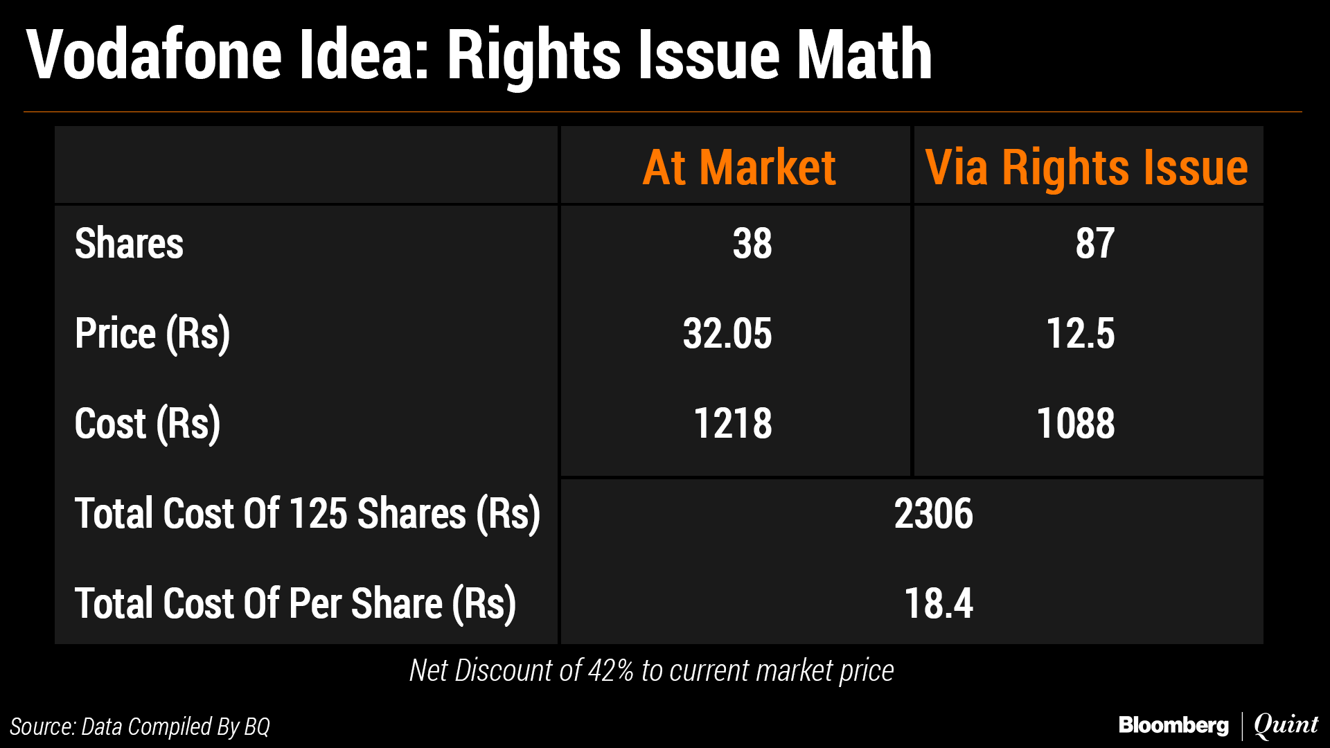 If an investor bought 38 shares of Vodafone Idea at Rs 32.05 (closing price as of March 19), then the effective cost price per share after subscribing to the rights issue will be at an effective discount of 42 percent to the closing price.