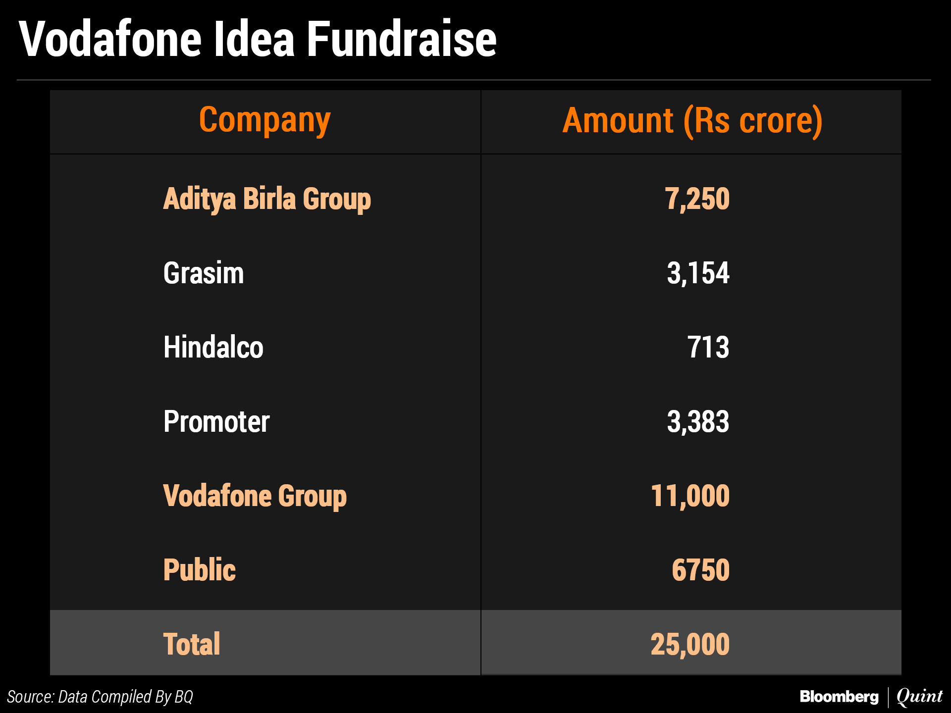 The company will use the funds to pare its massive debt of over Rs 1,23,660 crore (nearly $18 billion). Vodafone Group and the Aditya Birla Group would contribute Rs 11,000 crore and Rs 7,250 crore, respectively, according to the statement. The rest will be raised from public. Grasim Industries Ltd. and Hindalco Ltd. are the two listed Aditya Birla Group companies that own stakes in Vodafone Idea. Grasim and Hindalco hold 11.6 percent and 2.6 percent in the company, respectively.