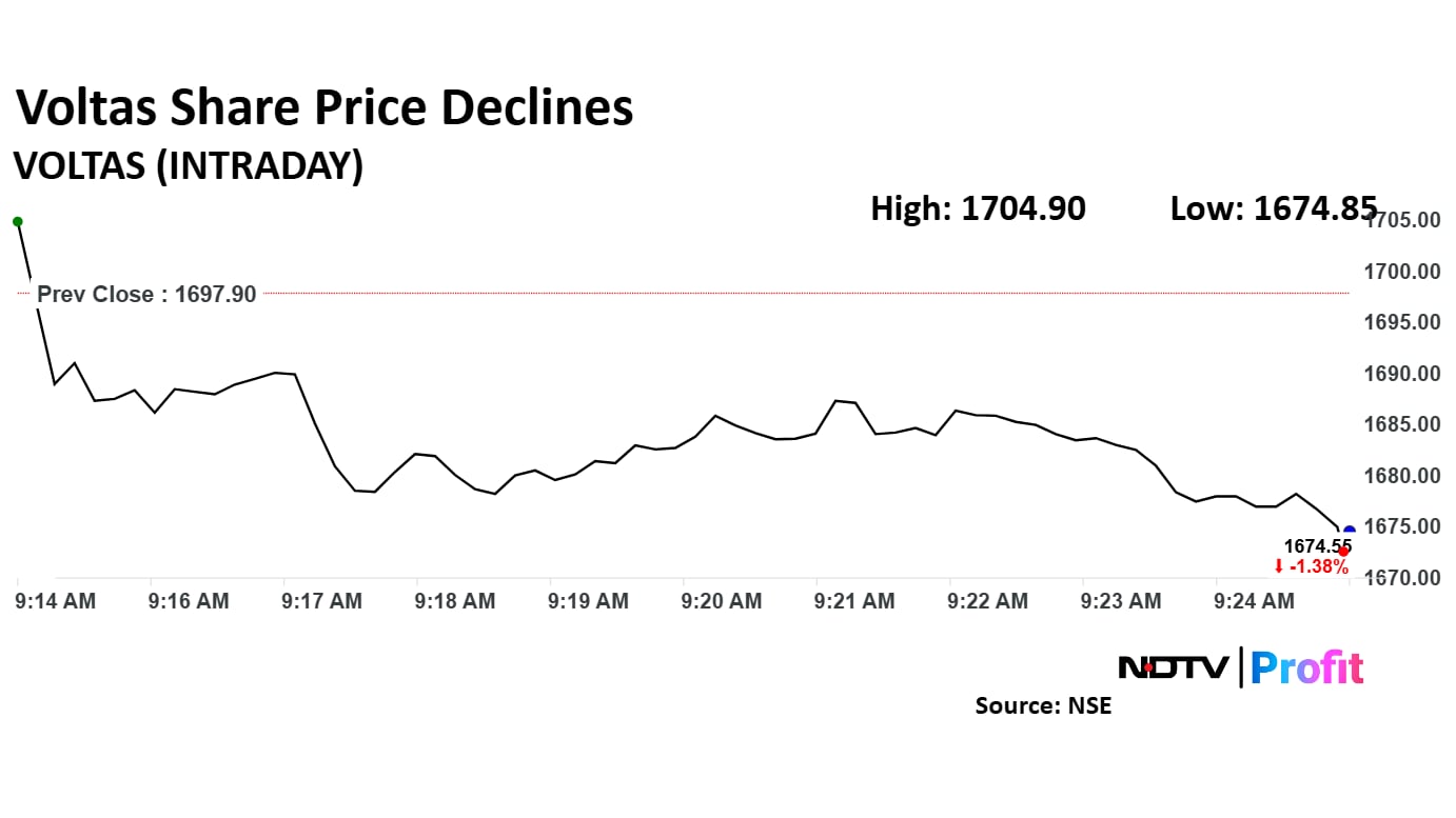 Voltas Ltd. share price declined to Rs 1,674.85 apiece. It was trading 0.70% lower at Rs 1,685.95 apiece as of 09:24 a.m., as compared to 0.15% decline in the Nifty 50 index.