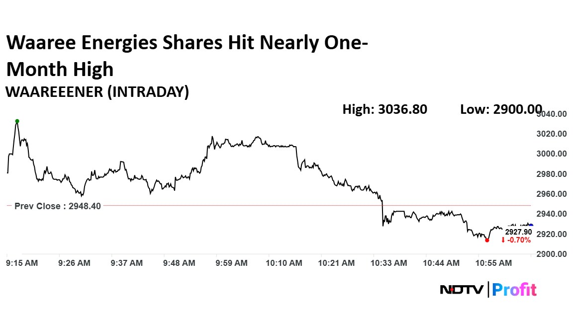 Shares of Waaree Energies rose as much as 3% to Rs 2,956.10 apiece, the highest level since April 23. It pared gains to trade 0.43% higher at Rs 2,961 apiece, as of 10:42 a.m. This compares to a 0.07% decline in the NSE Nifty 50.