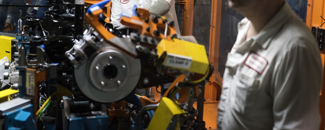 A production associate adds parts to the rear suspension of a vehicle during production. (Photographer: Ty Wright/Bloomberg)