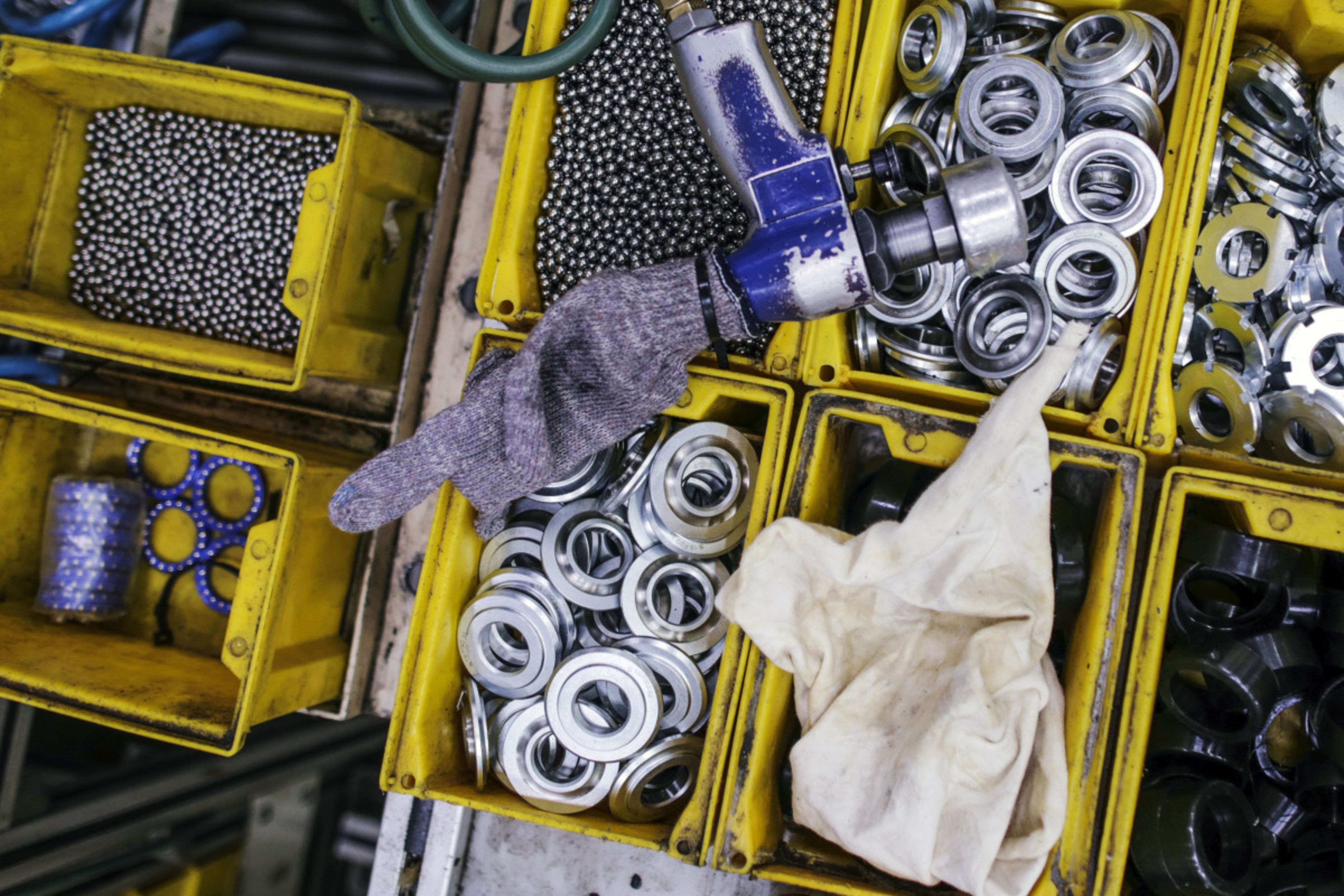 Auto parts sit in containers on the Royal Enfield production line, in Chennai. (Photographer: Dhiraj Singh/Bloomberg)