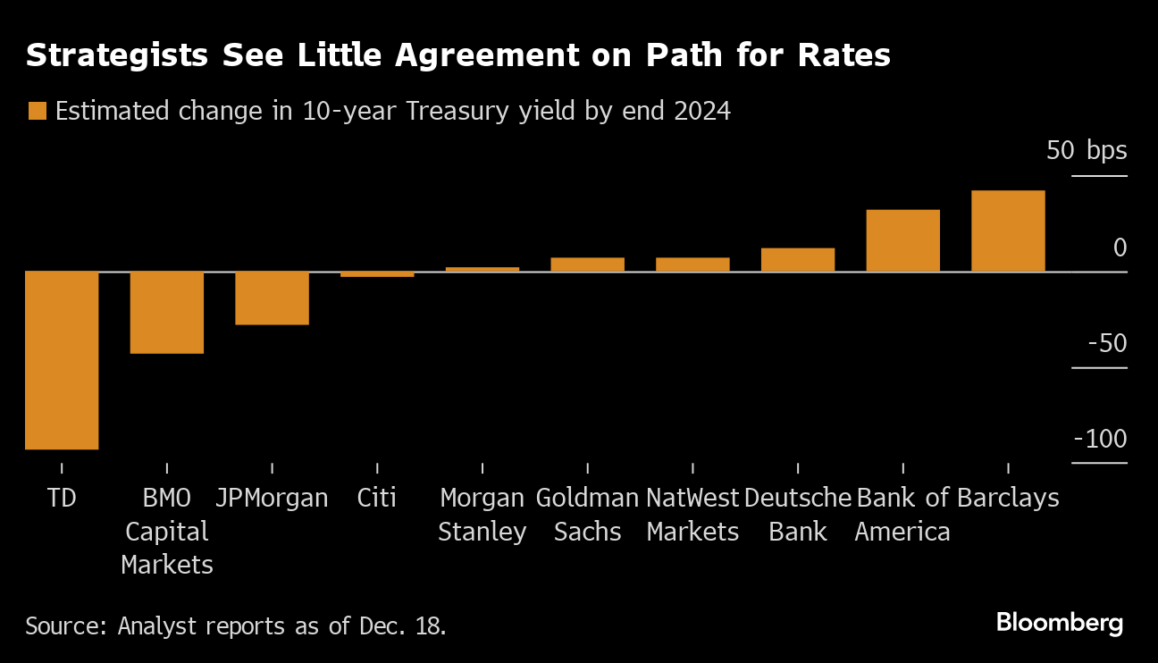(Bloomberg) -- The epic slide in Treasury yields suddenly unleashed last week by the Federal Reserve forced many Wall Street strategists to jettison days-old forecasts for 2024, but dissent still lingers between bulls and bears.