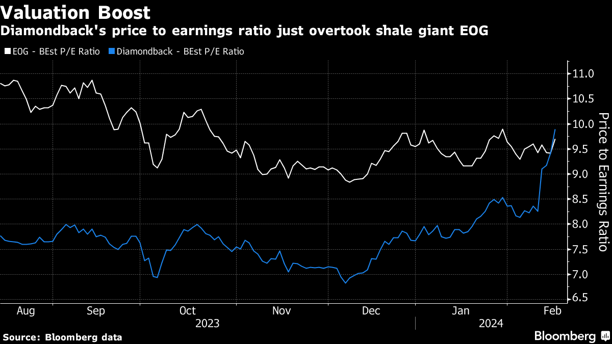 In the wake of the deal announcement, Diamondback is trading at 9.9 times earnings, overtaking EOG, which has pledged to sit out the current buying spree. Diamondback will jump to around 150th in the S&P 500 by market value, from 275th today, putting it on the radar of large investors in search of more exposure to the Permian Basin, the prolific oil field straddling the Texas-New Mexico border.