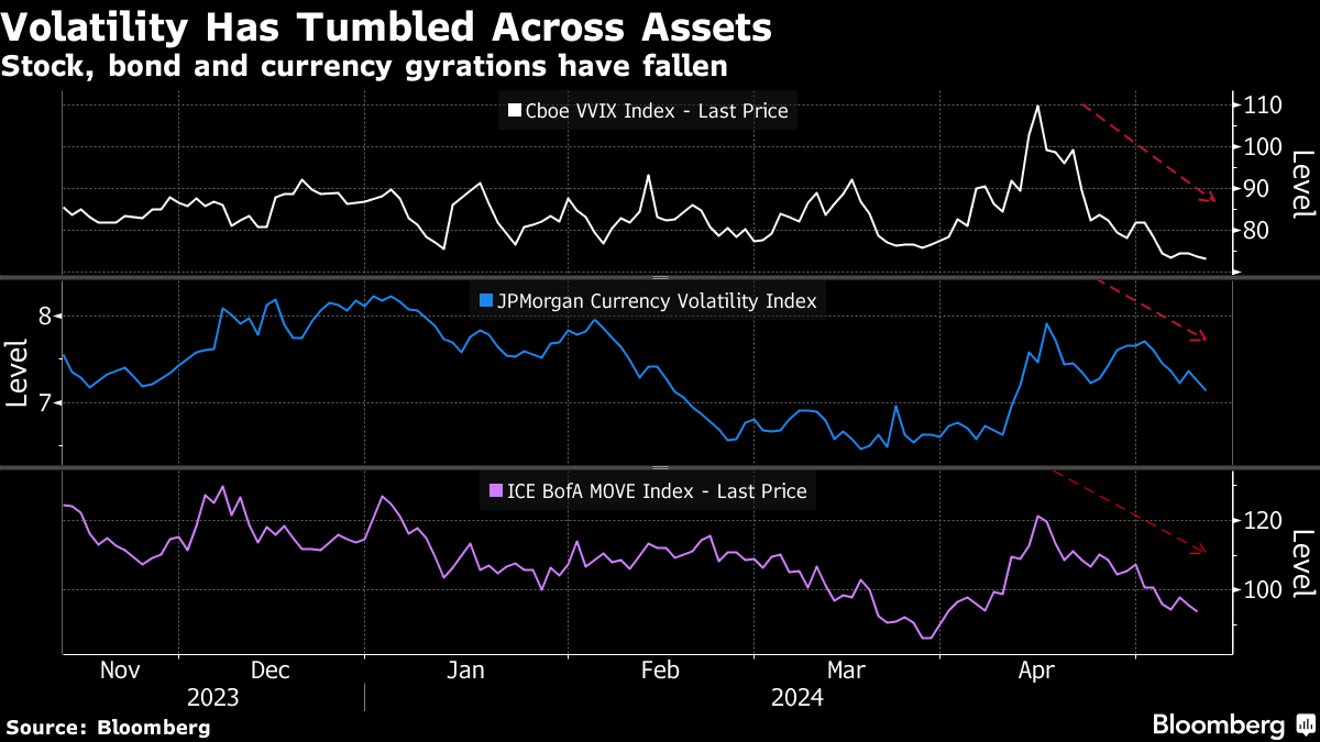The serenity on Wall Street comes as the S&P 500 scored its third straight weekly advance, notching a near 1.9% gain. Treasuries climbed for a second week as credit markets advanced. The VVIX Index — which measures expected swings in the equity-volatility index itself — hit its lowest level since 2015, a sign that investor appetite to hedge against a big selloff has waned.