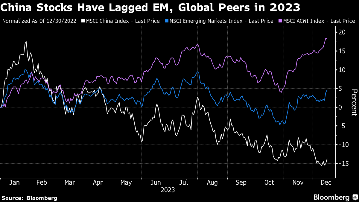 What a difference a year can make. Back in late 2022, Goldman Sachs Group Inc., JPMorgan Chase & Co. and Morgan Stanley were predicting at least 10% annual gains for the MSCI gauge as Beijing dismantled stringent Covid controls. A Bank of America Corp. survey showed funds were rushing to boost exposure to Chinese shares in anticipation of a robust economic reopening.