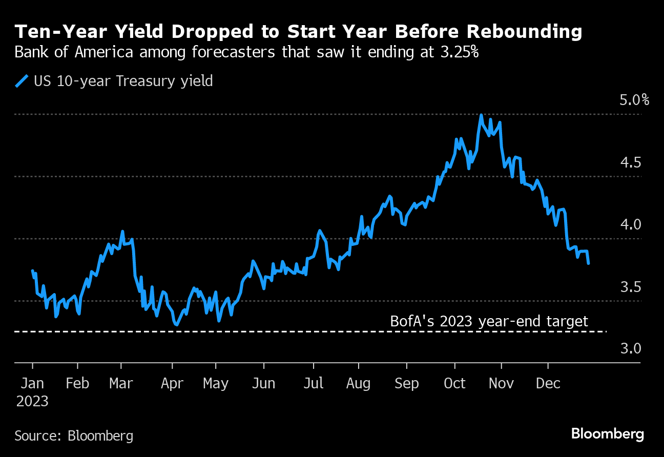 So Swiber and her colleagues on BofA's rate-strategy team — like the vast majority of forecasters — predicted solid gains for bond investors who had just been dealt their worst annual loss in decades. The bank was among a handful of firms calling for the yield on the benchmark 10-year note to drop all the way to 3.25% by the end of 2023.