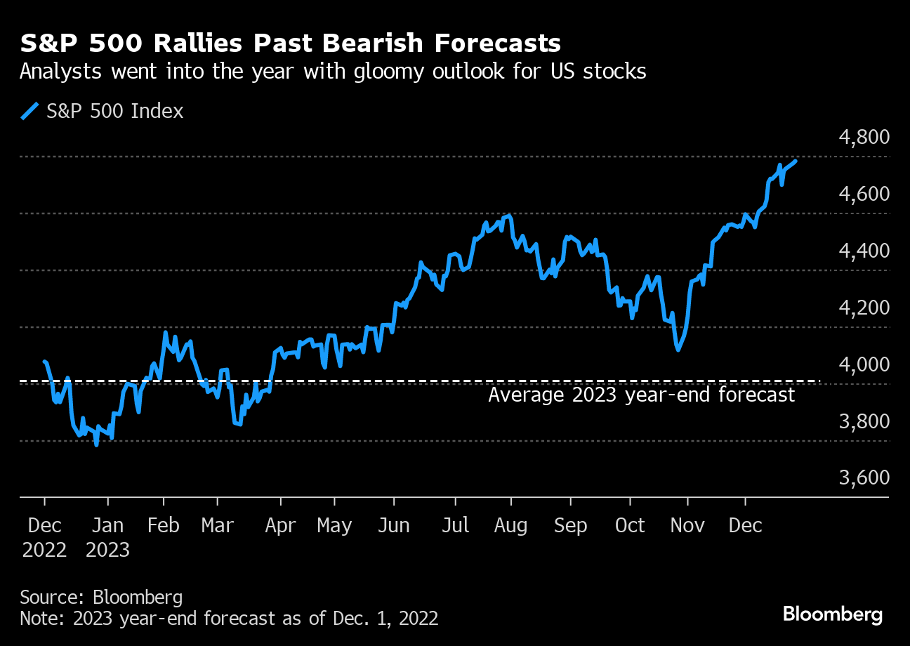 He suddenly had plenty of company, too. Last year's selloff, sparked by the rate hikes, spooked strategists. By early that December, they were predicting that equity prices would drop again in the year ahead, according to the average estimate of those surveyed by Bloomberg. That kind of bearish consensus hadn't been seen in at least 23 years. Even Marko Kolanovic, the JPMorgan Chase strategist who had insisted through much of 2022 that stocks were on the cusp of a rebound, had capitulated. (That dour sentiment has extended into next year, with the average forecast calling for almost no gains in the S&P 500.)