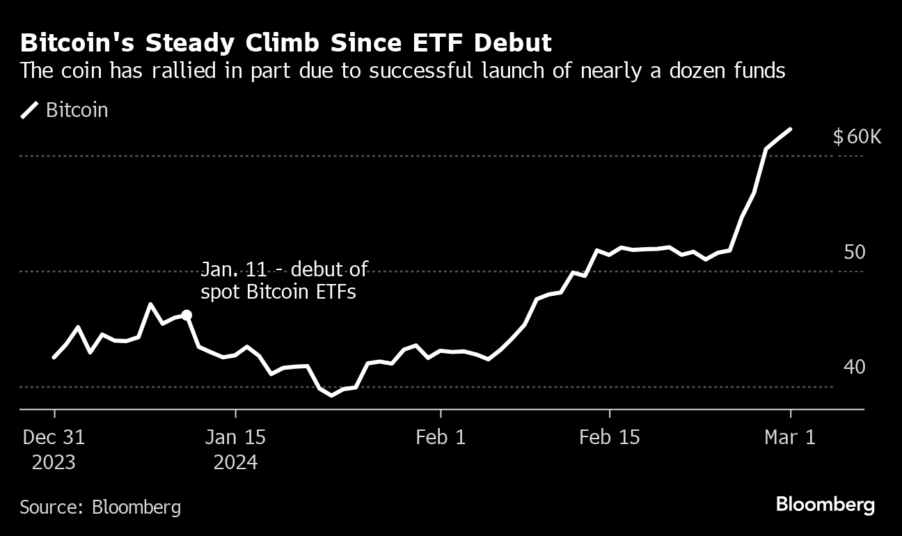 “The traders with leveraged, highly risky positions in cryptos should realize there will be an inevitable correction,” said Campbell Harvey, a finance professor at Duke University who studies digital-asset markets. “With leverage, you need to be prepared to lose everything.”Only time will tell how prepared the owners of the new ETFs are for a potential downturn in an asset class that — with no revenue stream or practical large-scale financial functionality -- makes it inherently volatile and susceptible to shifts in sentiment.Yet regardless if the next major milestone for Bitcoin is $70,000 or $50,000, many believe the opening of the ETF floodgates has changed the game forever — both in the traditional financial market and the crypto world.