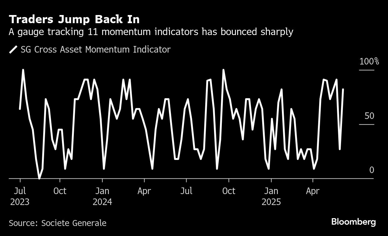 A Societe Generale SA index tracking cross-asset momentum has this month staged one of its sharpest reversals on record, with nine of 11 components emitting bullish signals. Trends derived across fixed income, equities and currencies were all flashing green when the conflict broke out. Price action like that is hard for Wall Street's risk traders to ignore, according to SocGen's Manish Kabra.