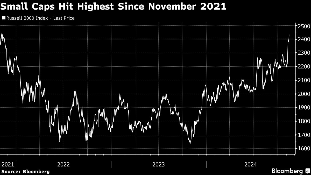 Economically sensitive shares outperformed, with the Russell 2000 index of smaller firms climbing 1.5% to the highest since 2021. A closely watched gauge of banks rose 2.4%. Most big techs fell, with Nvidia Corp. down 1.6%. Tesla Inc. jumped 9%, extending a blistering surge.
