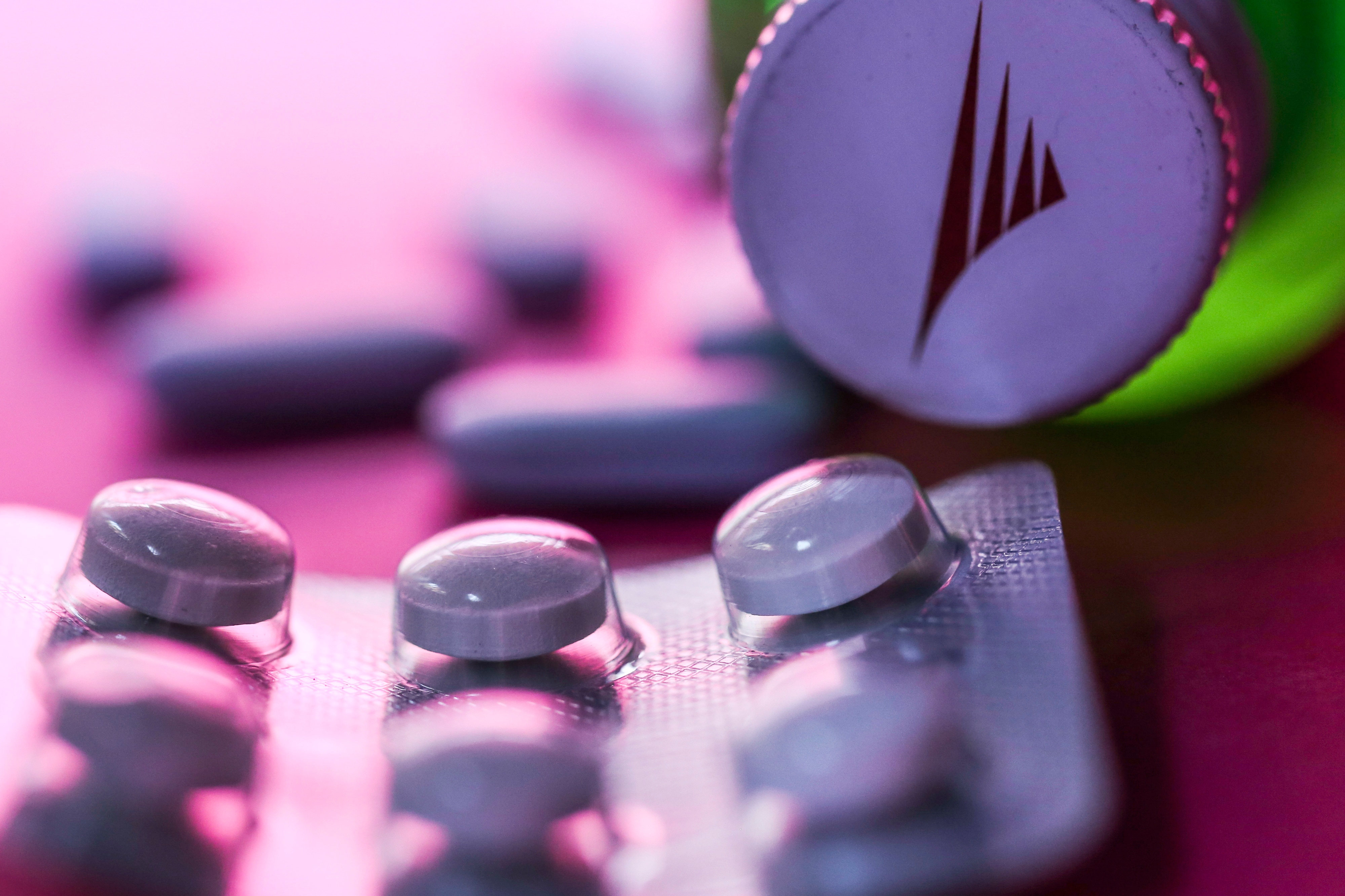 Wockhardt Ltd.’s Azithromycin Tbalets IP Aziwok-250 tablets, left and Zedex-SF dry cough syrup bottle are arranged for a photograph (Photographer: Dhiraj Singh/Bloomberg)