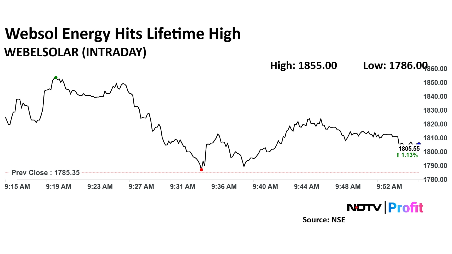 Websol Energy System Ltd.'s share price extended its gains to a fourth consecutive session and hit its lifetime high after the company informed the exchanges that it has placed purchase order for equipment for its additional capacity of 600 MW Cell line at Falta Plant.