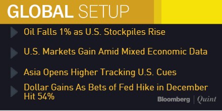 Global equity markets are posting gains even as crude resumed its decline. Oil fell nearly a percent as data showed U.S. stockpiles at their highest seasonal level in thirty years. Oil supplies climbed by 4.46 million barrels last week, according to the American Petroleum Institute.