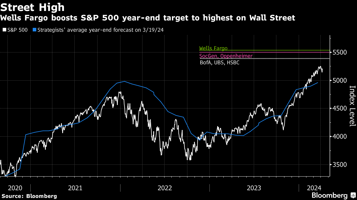Harvey joins peers at several other major Wall Street firms — including Goldman Sachs Group Inc., Bank of America Corp., and Oppenheimer Asset Management — that have ratcheted up their 2024 outlooks for US equities in recent months. His new call for the S&P 500 implies a roughly 6% gain from Monday's level of about 5,200.
