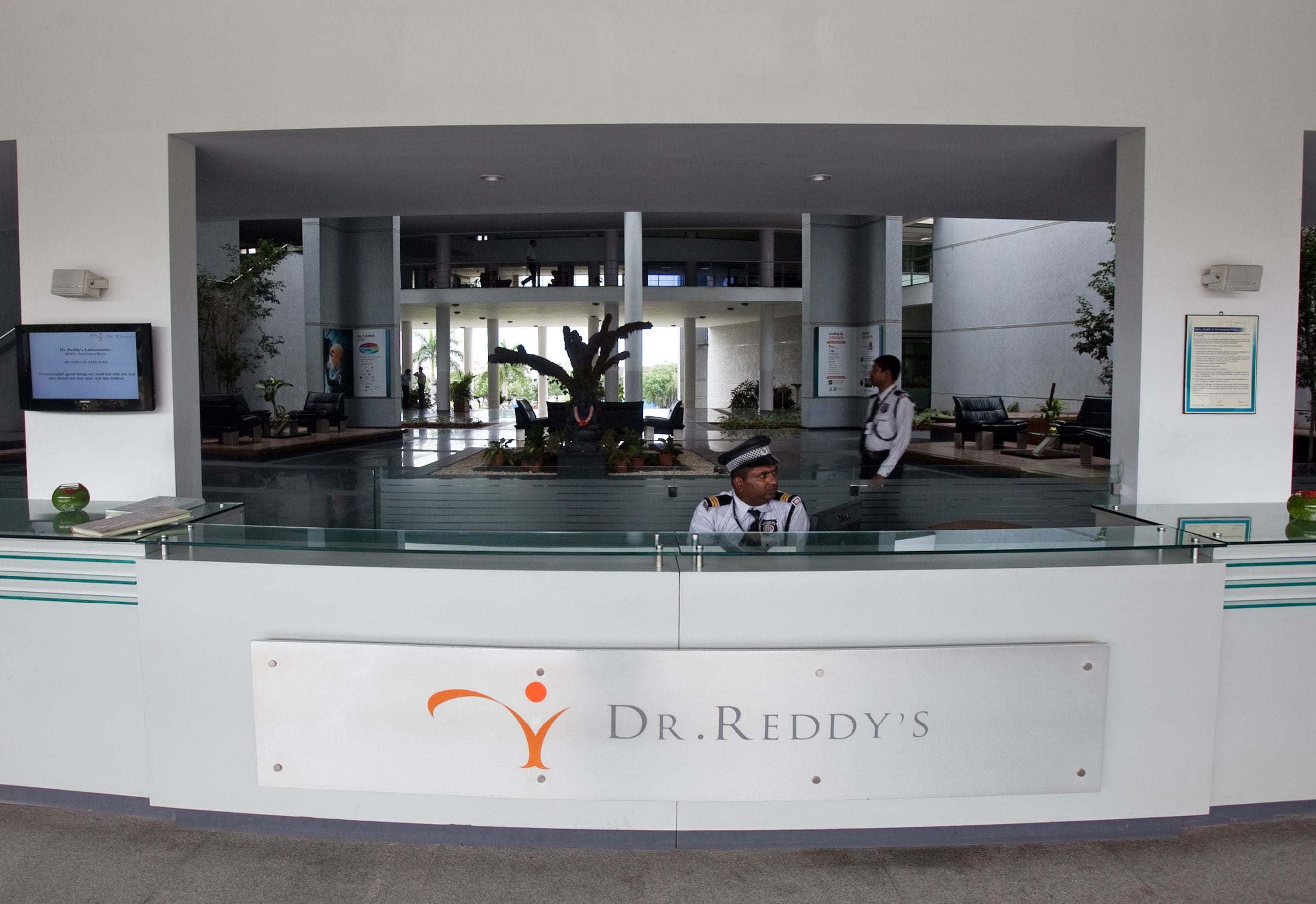 Security guards work in the lobby of the Innovation Plaza building, on the Dr. Reddy’s Laboratories Ltd. campus in Hyderabad, India. (Photographer: Prashanth Vishwanathan/Bloomberg)