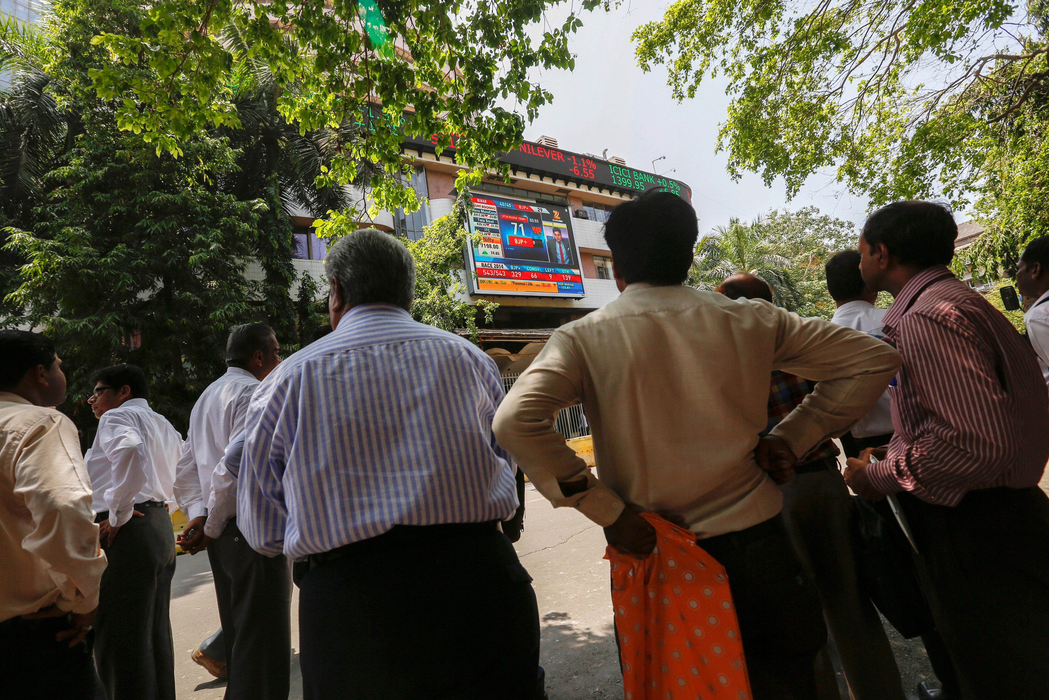 People gather to look up at an electronic screen showing television coverage of the Indian general election at the Bombay Stock Exchange (BSE) in Mumbai. (Photographer: Vivek Prakash/Bloomberg)