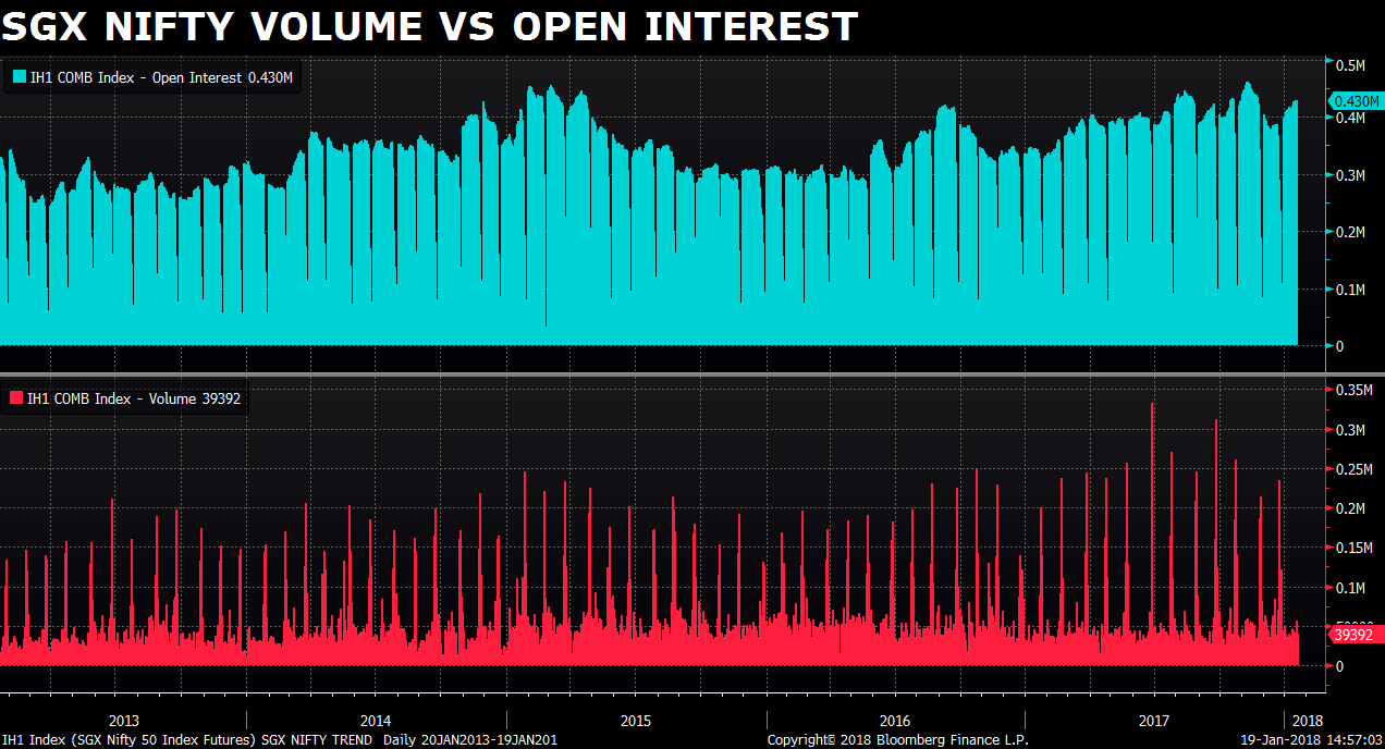 The most active product on the SGX is Nifty Futures with a daily turnover of around $1 billion and $9 billion worth of outstanding contracts as of Jan. 18. That compares with nearly $3.4 billion of open interest of FPIs in Nifty and Nifty Bank Futures on the NSE.