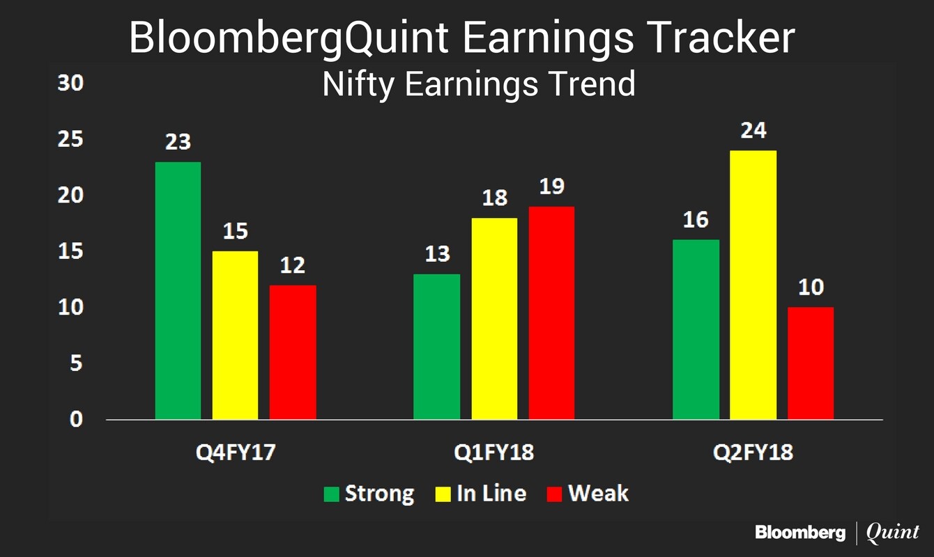 The BloombergQuint earnings tracker shows that in the previous (July-September) quarter, 24 out of the 50 Nifty companies reported results which met expectations, while 16 reported strong numbers. The analysis of the past three quarters showed that the trend of results outperforming estimates is narrowing down.
