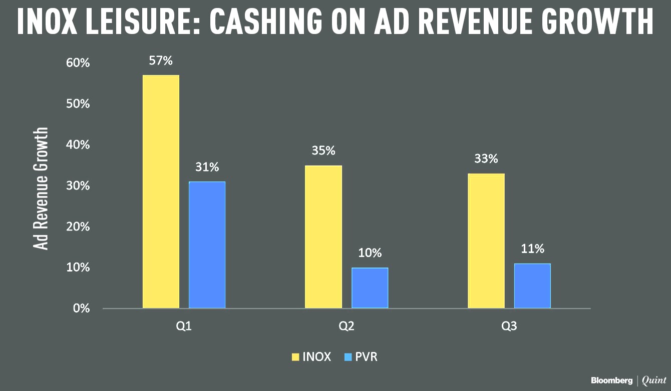 The reason: growth in advertising revenue. INOX's income from promotions ahead of and during the movies rose more than 30 percent in the last three quarters compared with 10 percent growth for PVR.