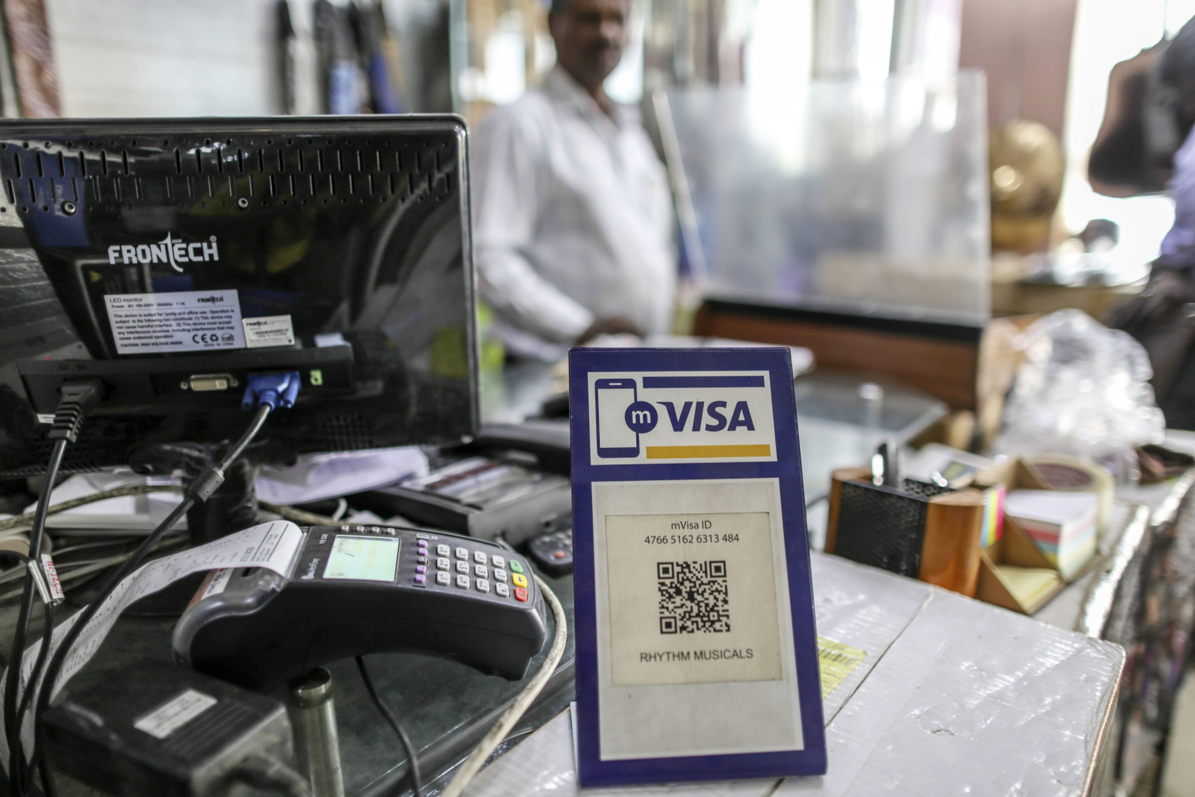 Signage for digital payment service mVisa, operated by Visa Inc., is displayed at a store selling musical instruments in Bengaluru. ( Photographer: Dhiraj Singh/Bloomberg)