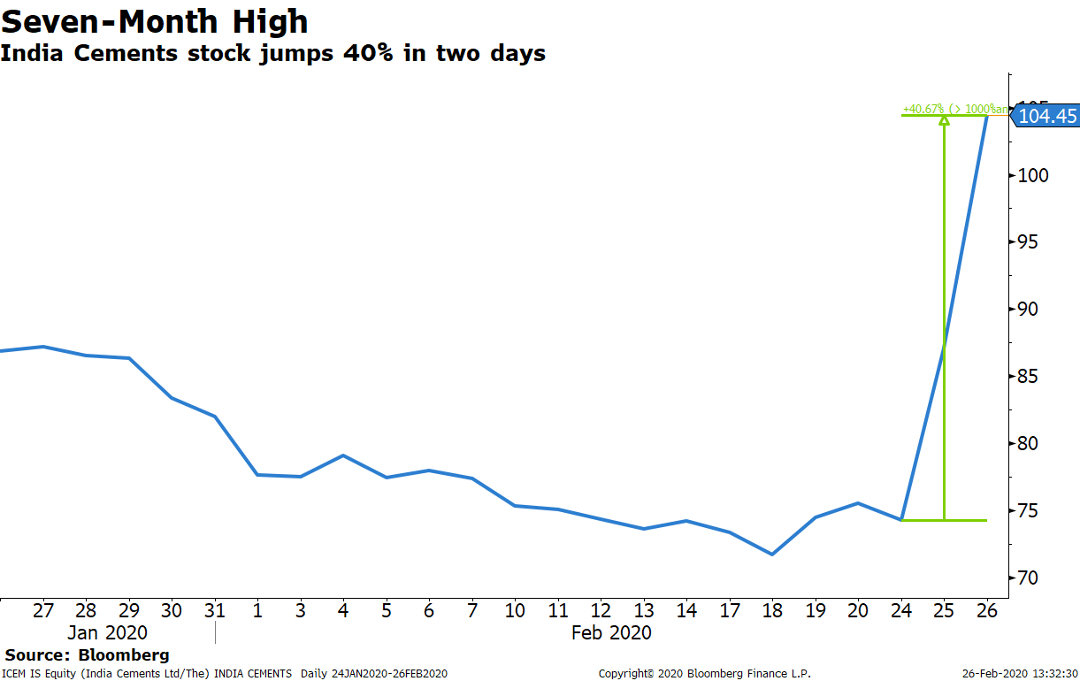 Aided by the latest surge, India Cements stock has rallied nearly 45 percent so far this year, beating peers. Orient Cement Ltd. has gained 23 percent, JK Cement Ltd. is up 22 percent and Birla Corp Ltd. has risen 21 percent.