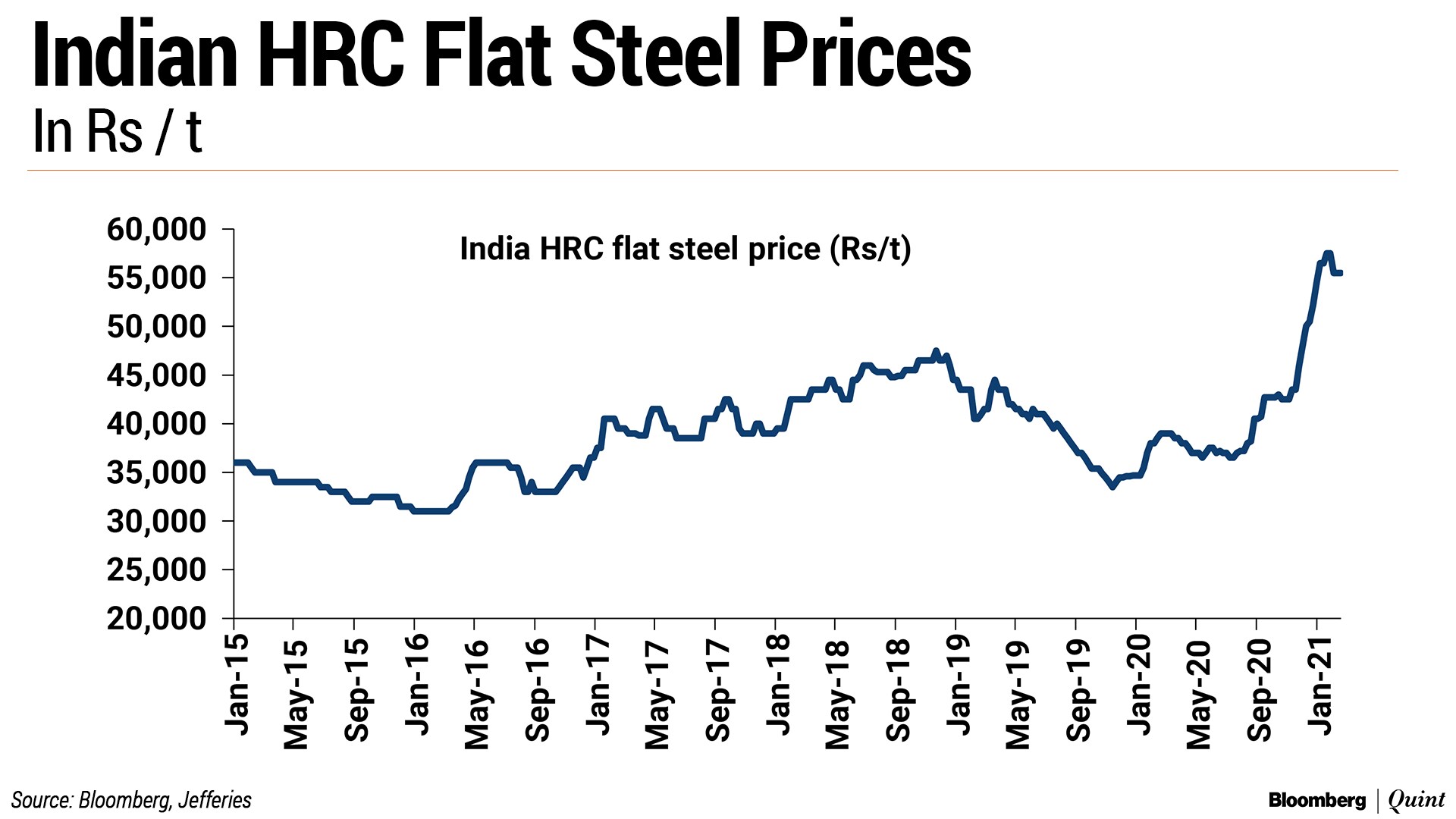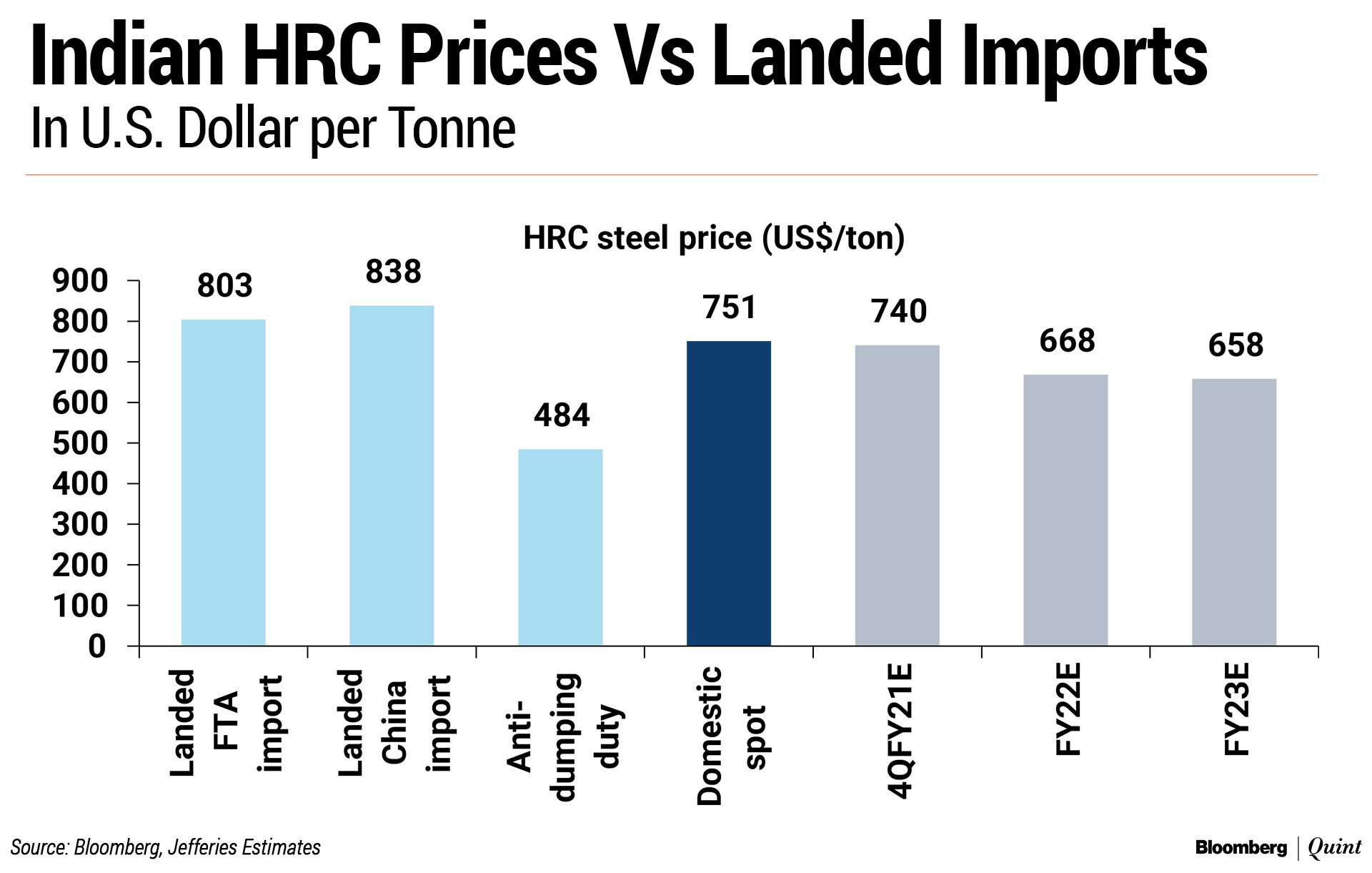 Indian HRC steel prices, according to Jefferies, corrected from their peak of Rs 57,500 a tonne in January to Rs 53,500 in March, but have since slightly improved to Rs 54,500 per tonne. “With the recent rally in Asian steel prices, Indian HRC prices are now at a 7-10% discount to landed imports.”